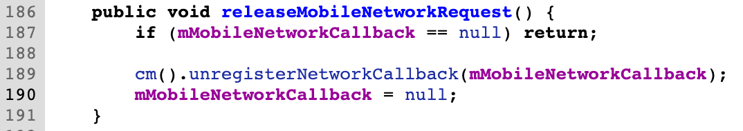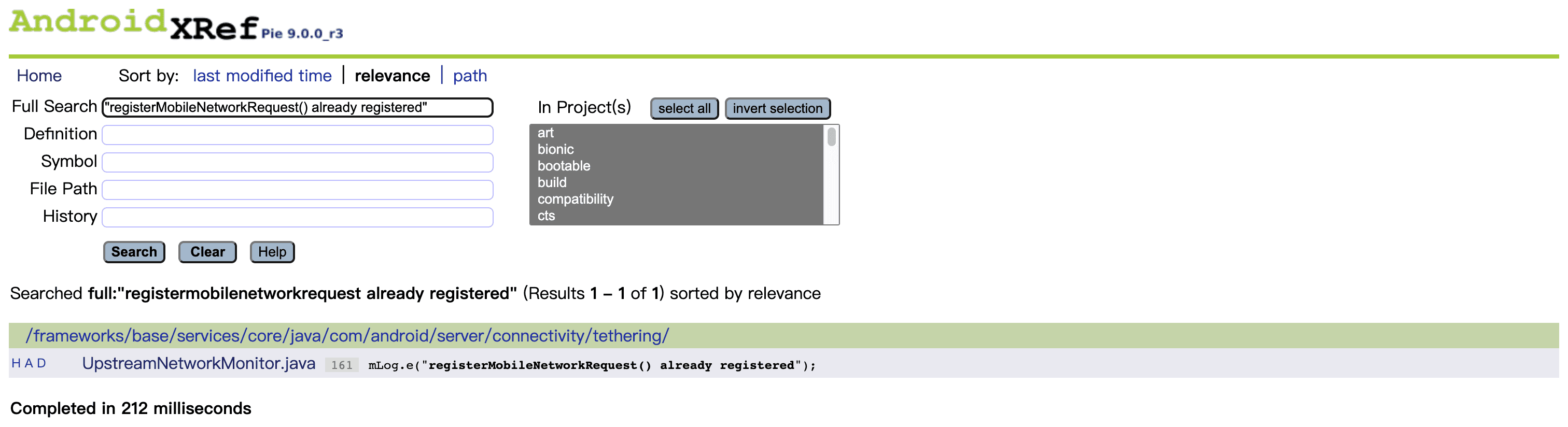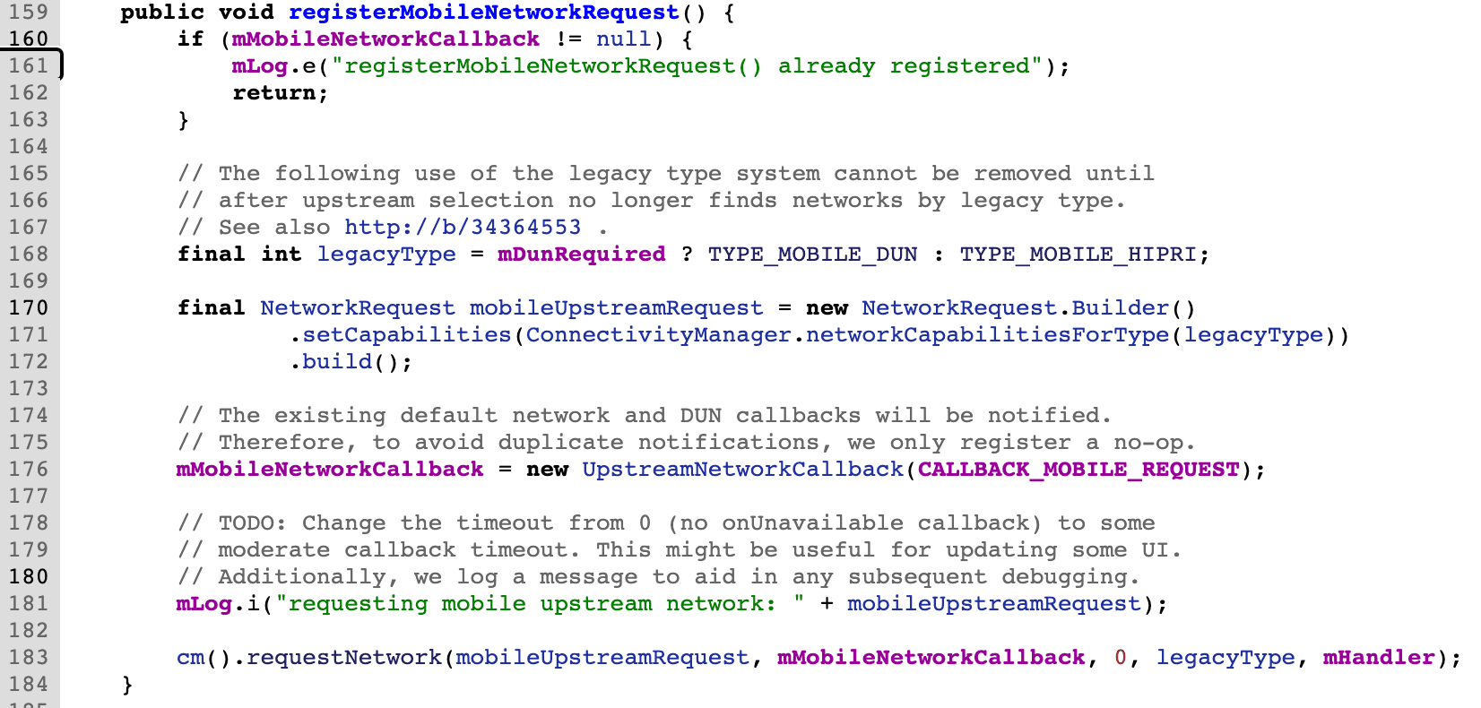 registerMobileNetworkRequest() already registeredを検索する- `packages/modules/Connectivity/Tethering/src/com/android/networkstack/tethering/UpstreamNetworkMonitor.java