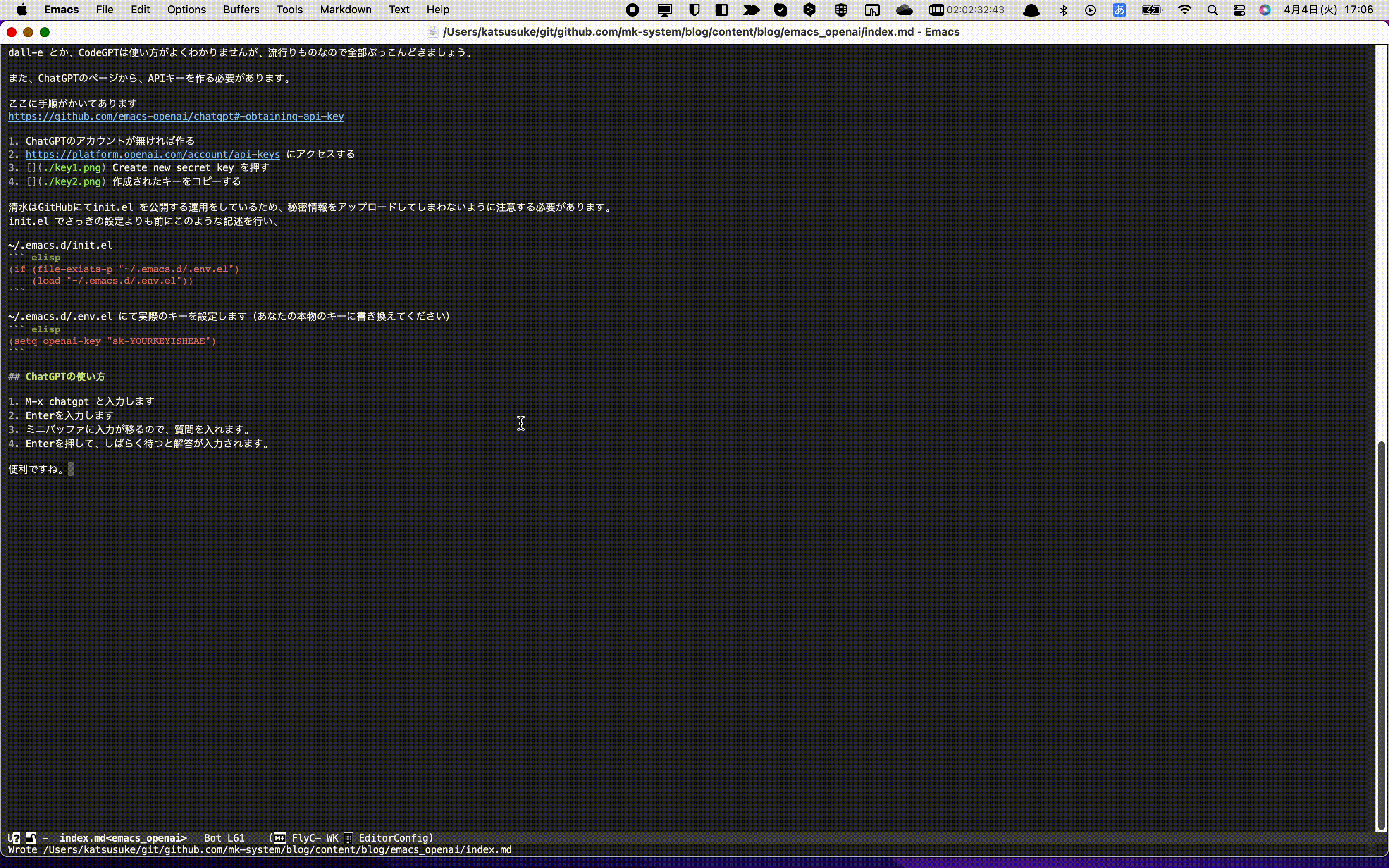 (setq openai-key "sk-YOURKEYISHEAE")ChatGPTの使い方