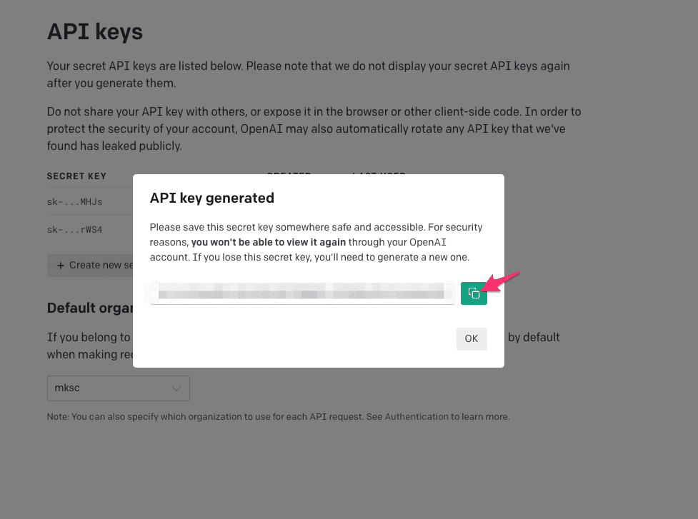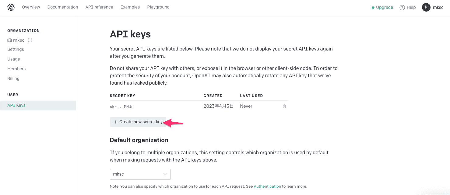 また、ChatGPTのページから、APIキーを作る必要があります。