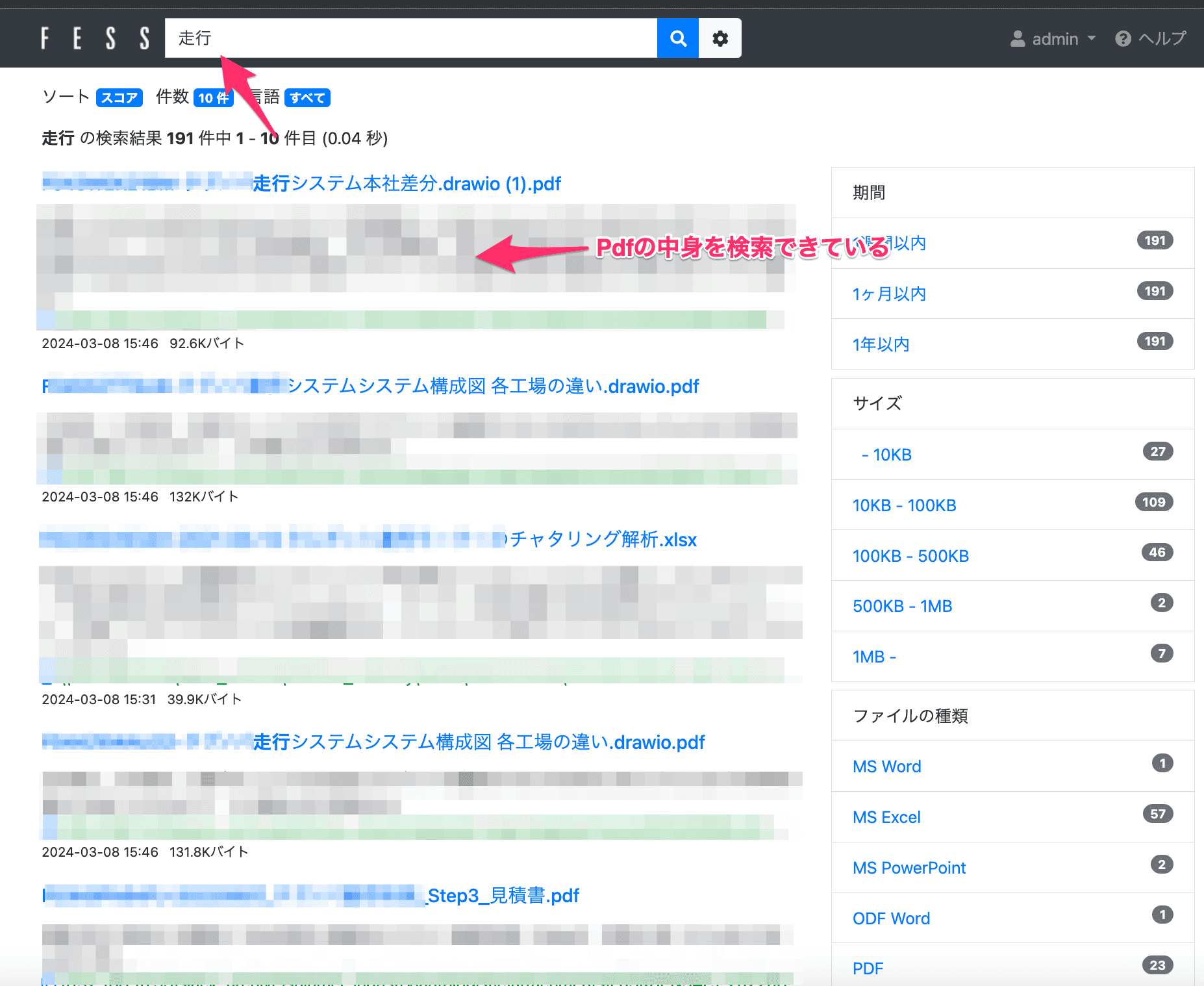 また、ファイル名だけではなく、pdfの中身も検索できました。