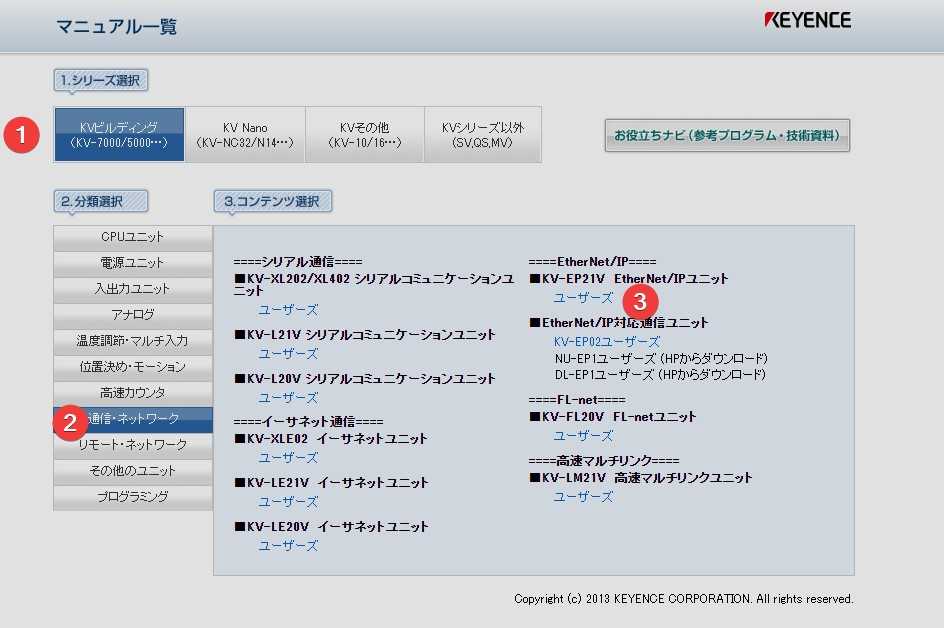 すると一覧画面が開くので、通信ネットワーク => KV-EP21V EtherNet/IPユニットからダウンロードできます