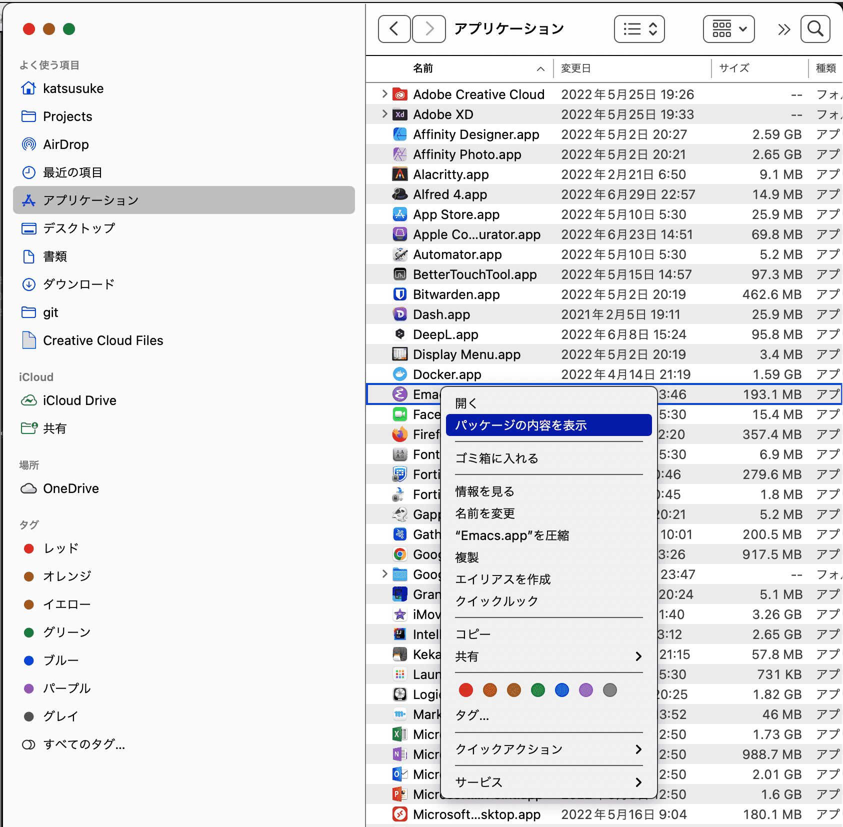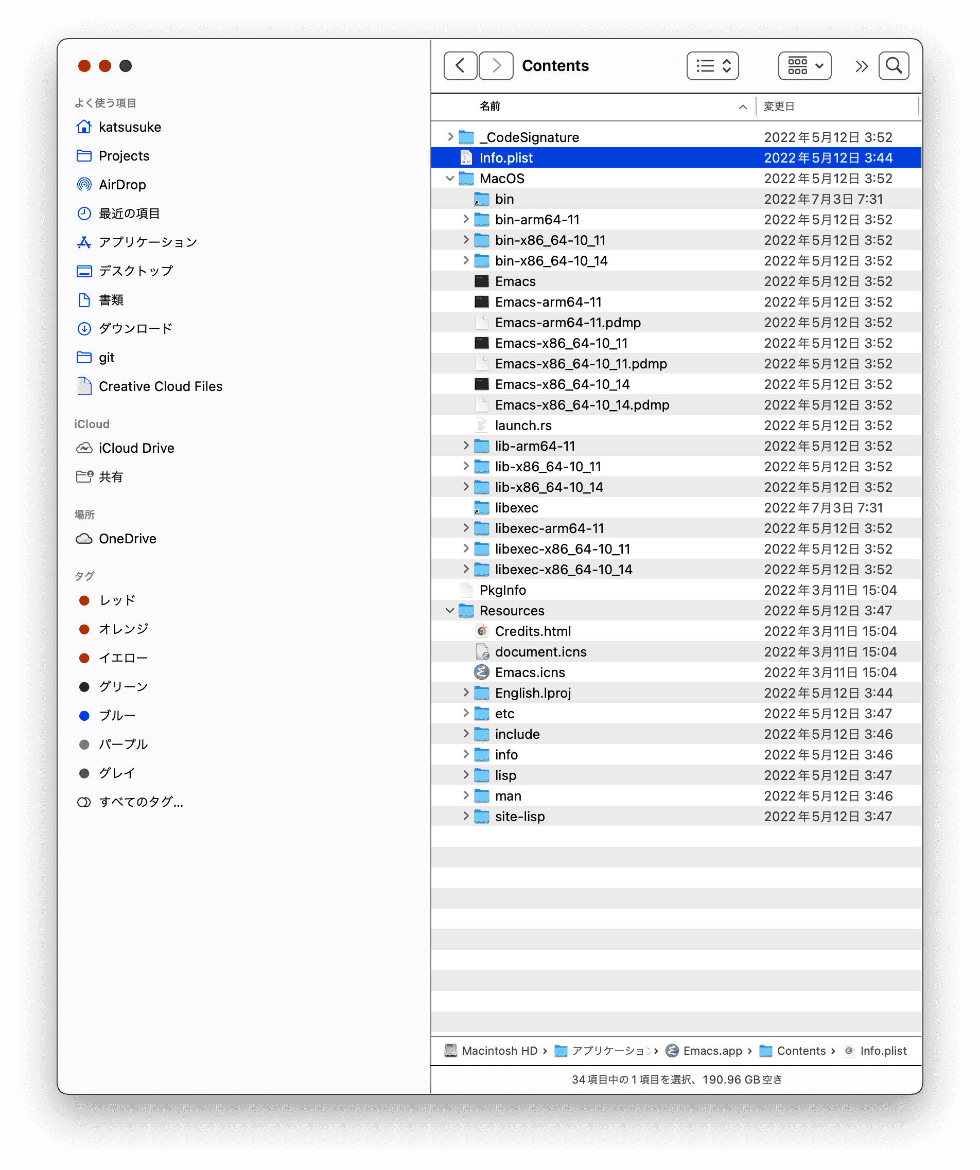 よくわからないのでEmacs.app の中身を見てみましょう. macOS のアプリケーションはディレクトリになっており、 中身を覗くと結構色路な情報を見ることができます.