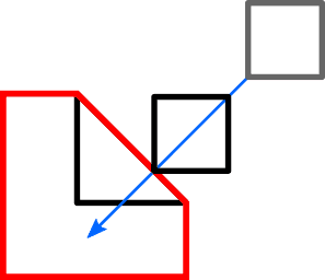 後は、頂点の赤枠の軌道と移動時の青い軌道の交点が、図形同士が衝突した時の四角形の左下頂点の座標となります。