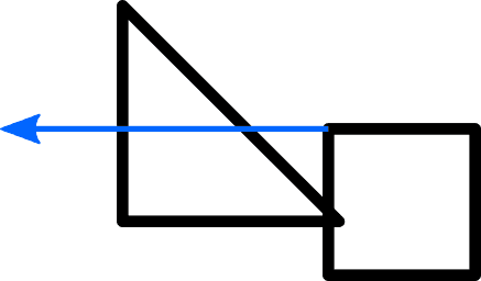 下図では視覚的に三角形の右端に衝突しそうですが、四角形の頂点の軌道は斜辺とのみ交わるためここを衝突点とすると、四角形が三角形にめり込んでしまいます。