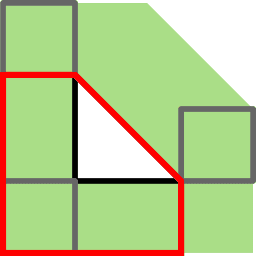 次に移動する四角形を衝突先の三角形の周りに沿って一周させた図形を考えます。すると下図のように四角形の軌道は緑のエリアで表され、また四角形の左下頂点の軌道は赤枠で表されます。